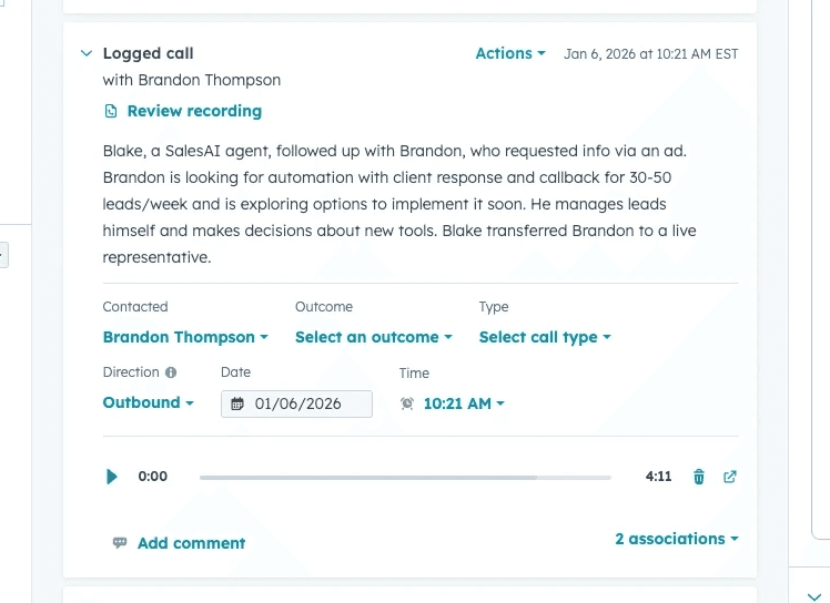 Every call is logged directly to your Company and Contact records, complete with call durations, recordings, and summaries. Your team will be armed with all of the data they need to close the sale.